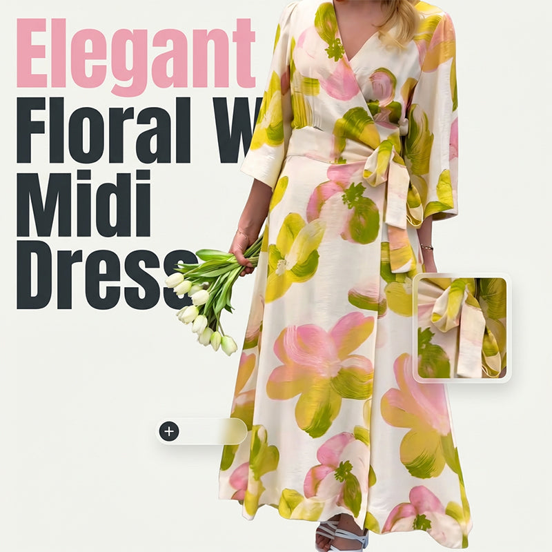 ELEGANTNA MIDI HALJINA S CVJETNIM UZORKOM - Otkrijte savršen spoj udobnosti i stila uz ovu elegantnu midi haljinu s cvjetnim uzorkom. S laskavim V-izrezom i podesivim strukom s vezicom za besprijekorno pristajanje.