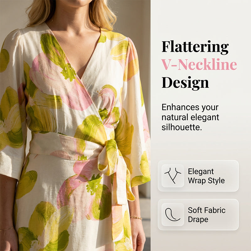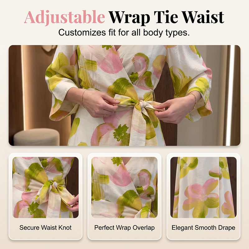 PODESIVI STRUK S OMOTAVANJEM - S pravim dizajnom koji se omotava i podesivim bočnim vezicama, ova haljina vam omogućuje da prilagodite kroj svom točnom obliku tijela, osiguravajući maksimalnu udobnost i laskavi struk.